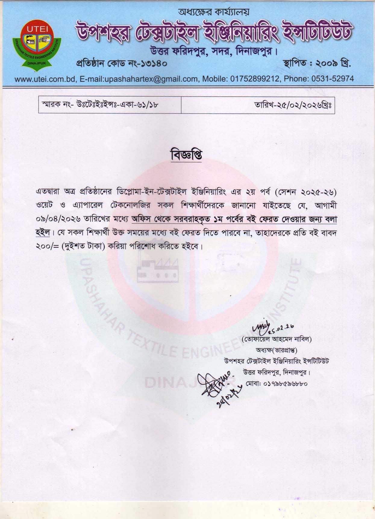 উপশহর টেক্সটাইল ইঞ্জিনিয়ারিং ইন্সটিটিউট এর অফিসিয়াল ওয়েবসাইটে আপনাকে স্বাগতম.................